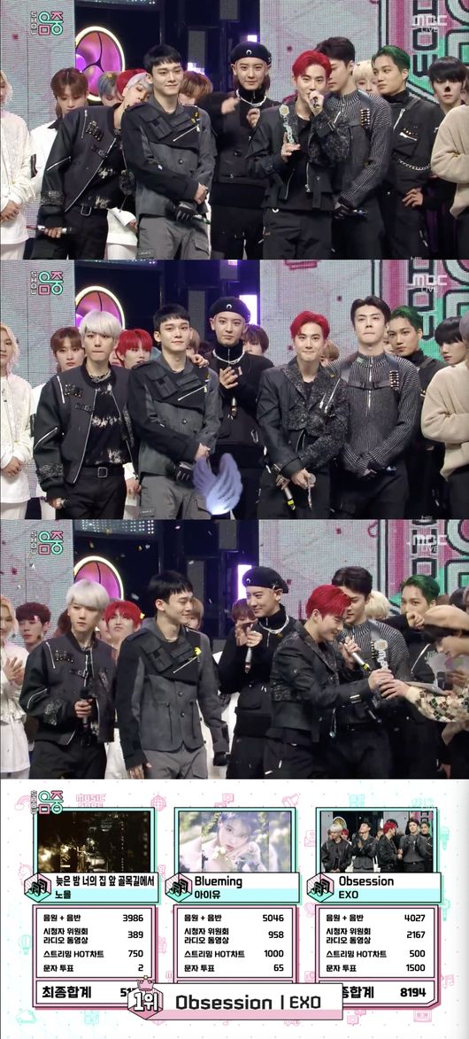 7일 오후 방송된 MBC '쇼! 음악중심'에서는 노을, 아이유, 엑소가 1위 후보에 오른 가운데 엑소가 1위에 올랐다.
