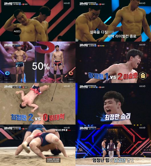 지난 7일 방송된 KBS 2TV 새 예능프로그램 ‘태백에서 금강까지 - 씨름의 희열’(이하 ‘씨름의 희열’) 2회에서는 ‘태극장사 씨름대회’ 예선 1라운드 체급별 라이벌전 두 번째 이야기가 그려졌다.