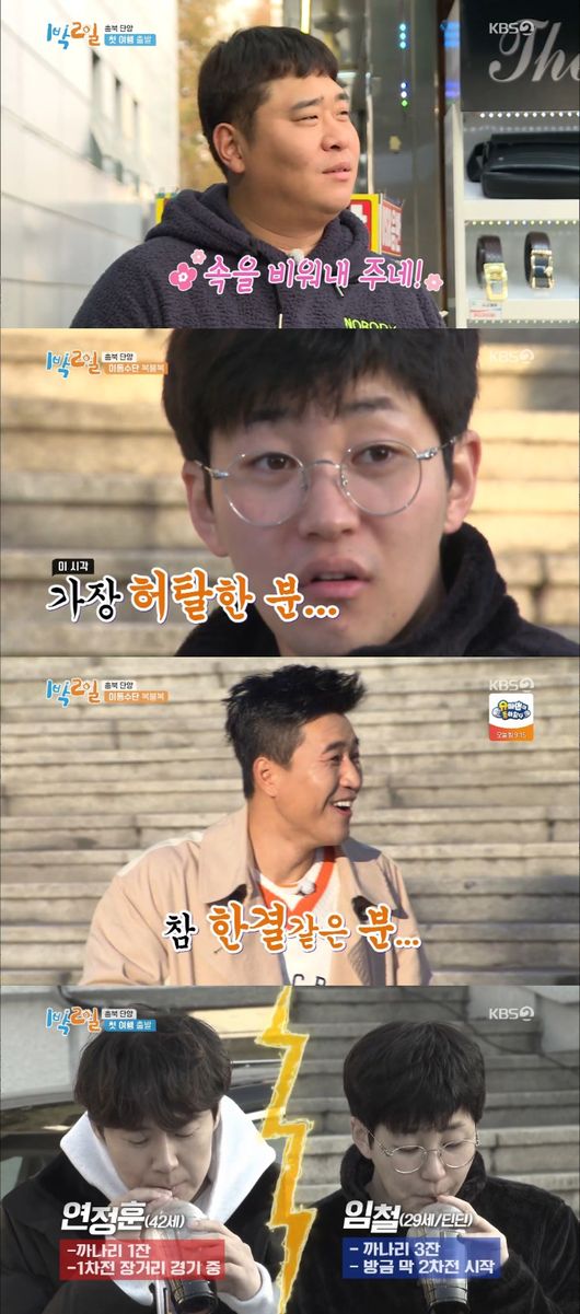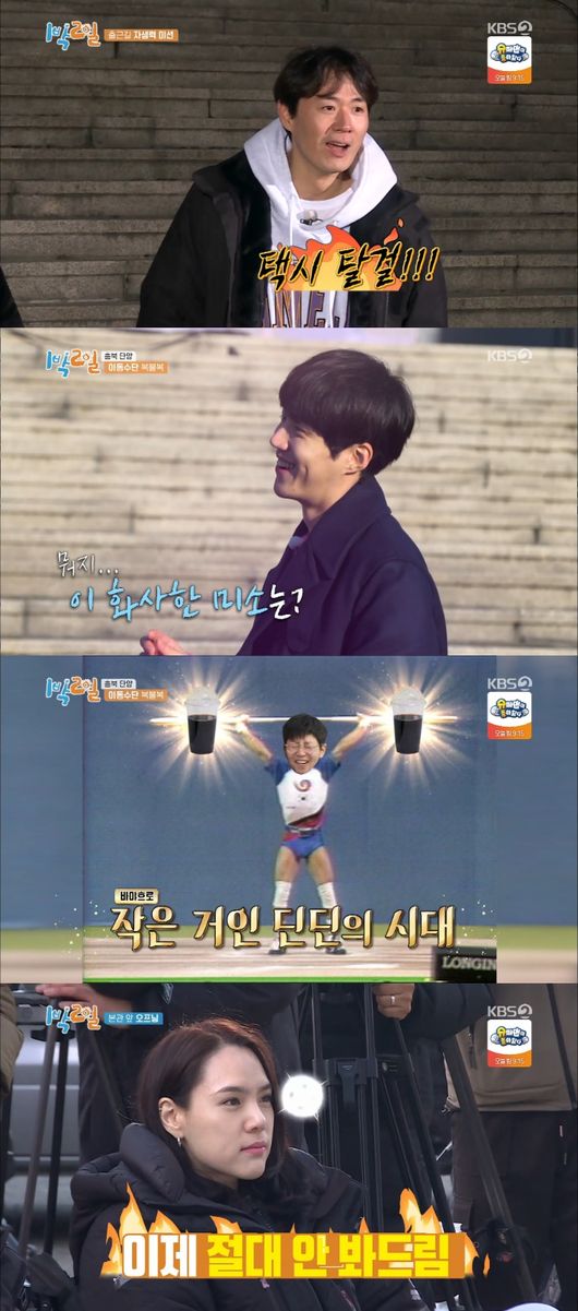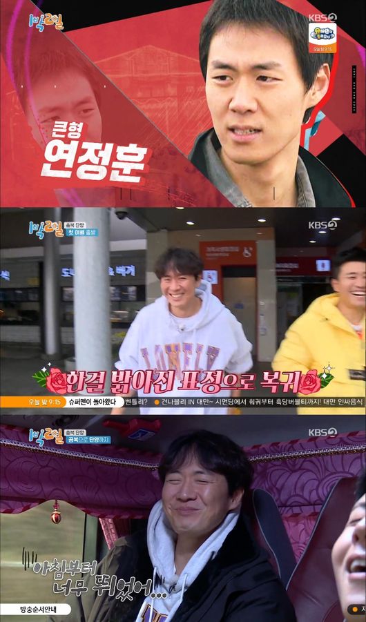 8일 오후 첫 방송된 KBS2 예능 프로그램 ‘1박2일 시즌4’에서는 연정훈, 김종민, 문세윤, 딘딘, 김선호, 라비 등 멤버들이 모여 첫 여행지인 충청북도 단양으로 떠나는 모습이 그려졌다.