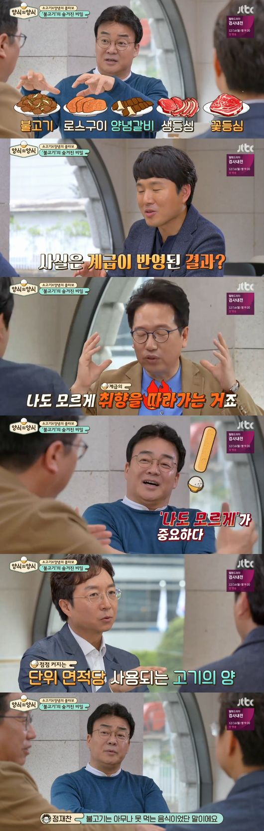 이어 시대에 따라 고기 문화가 변화해 왔다면서 불고기에서 로스구이 ,양념갈비에서 생등심, 또 다시 꽃등심으로 변화했다고 했다. 백종원이 "돈의 흐름과 연관이 있을까" 질문하자, 채작가는 "트렌드 변화에 구별짓기가 숨어있는 전략"이라 했다. 언뜻보면 개인의 취향처럼 보이지만 계급의 취향이 반영되어 있는 것 같다는 이유였다. 이에 정교수는 "나도 모르게 취향에 들어가게 되는 것, 계급의 취향에 따라 소고기들이 변화했다"고 덧붙였다.
