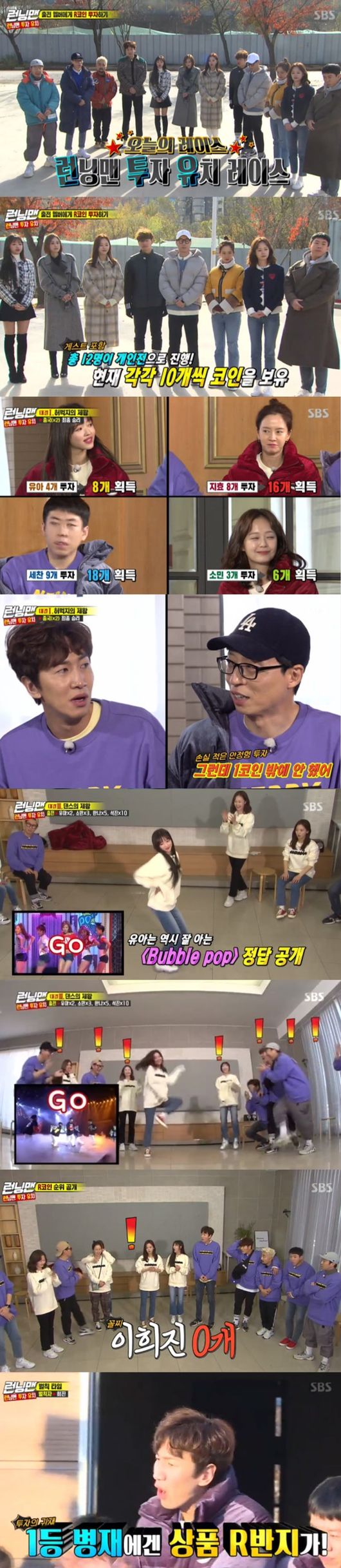 이날 방송은 ‘런닝맨 투자 유치 레이스’로 펼쳐져 배우 강한나, 이희진, 오마이걸의 유아, 방송인 유병재가 게스트로 함께 했다. 멤버들은 각 라운드마다 출전하는 멤버들에게 R코인을 투자해 자산을 불릴 수 있고, R코인이 가장 없는 사람이 벌칙을 받게 된다.