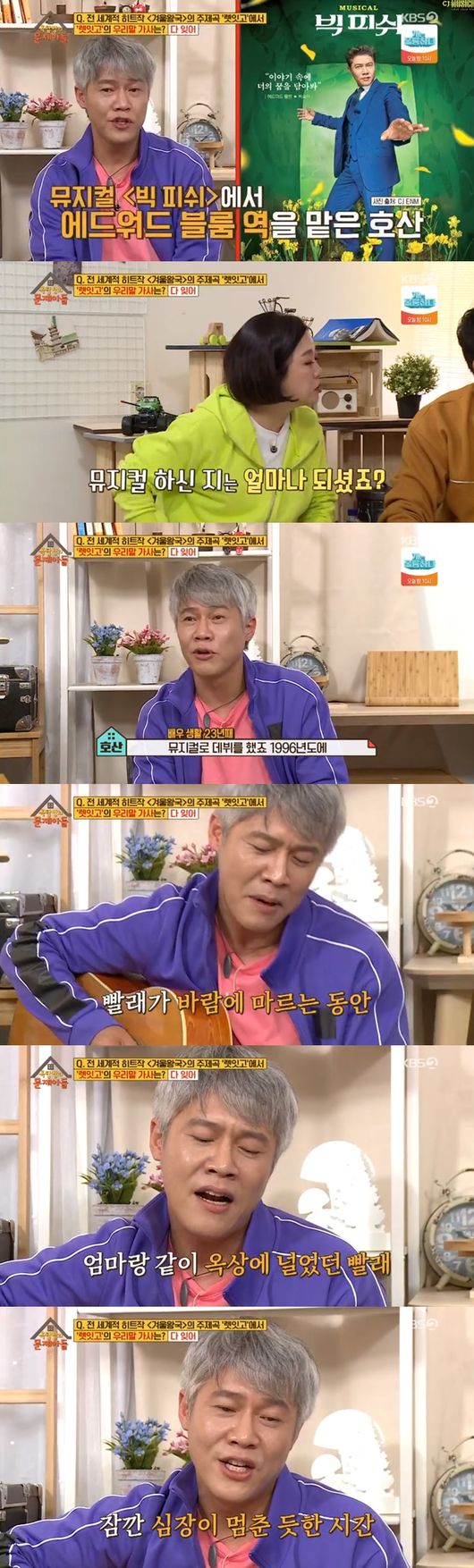 이어 박호산은 "'빨래'도 출연했다"라며 통기타를 치며 뮤지컬 빨래 중 노래 한 곡을 불러 시선을 집중시켰다. 이어서 '빅 피쉬'의 노래 '멈춘 순간'까지 연달아 불러 눈길을 끌었다. 박호산은 MC들의 요청에 의해 '지금 이 순간'까지 불러 감탄을 자아냈다.