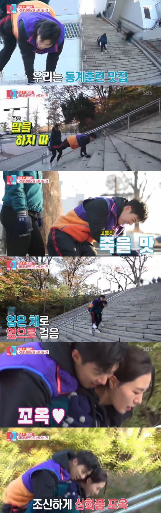 이에 이상화는 "업혀라"면서 급기야 단숨에 강남을 업고 앞으로도 모자라 업은 채로 옆으로 계단을 올라 지켜보는 이들을 놀라게 했다.
