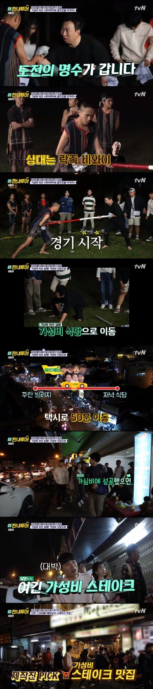이날의 가심비 미션은 5성급 호텔 레스토랑에서 정통 프랑스 요리를 즐길 수 있었다. 1인단 85000원의 식사였다. 그에 비해 가성비 레스토랑은 인당 1500원의 베트남 스테이크 식당이었다. 따이꺼이라는 막대를 이용해서 상대방을 막대 밖으로 보내는 미션이었고, 7명 전원 승리를 이뤄야 가심비로 이동이 가능했다.