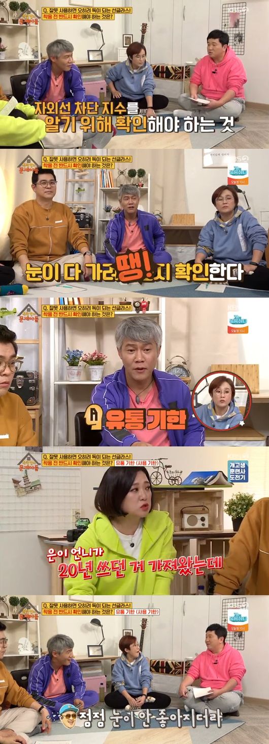 김숙은 깜짝 놀라며 "나는 송은이 언니가 20년 동안 쓴 선글라스를 가져왔다"라고 말했다. 이에 민경훈은 "선글라스 유통기한이 1년 정도 밖에 안된다. 쓰기 전에 안경점에 가서 자외선 차단 지수를 확인해야 한다"라고 말했다. 이에 김숙은 "어쩐지 송은이 언니 선글라스를 끼면 눈이 피곤하더라"라고 말해 웃음을 자아냈다.