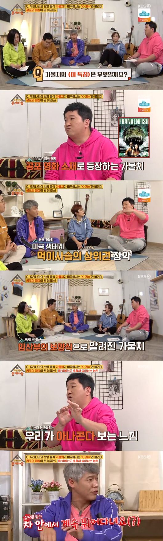 다음 문제는 가물치에 관련된 문제였다. 미국에서 가물치가 공포의 대상이 됐다는 것. 이에 정형돈은 "가물치가 물 속에 있는 모든 걸 잡아 먹는다고 하더라. 상위 포식자가 없다고 하더라"라고 말했다. 이에 박호산은 "가물치의 포식자는 임산부다"라고 말해 웃음을 자아냈다.