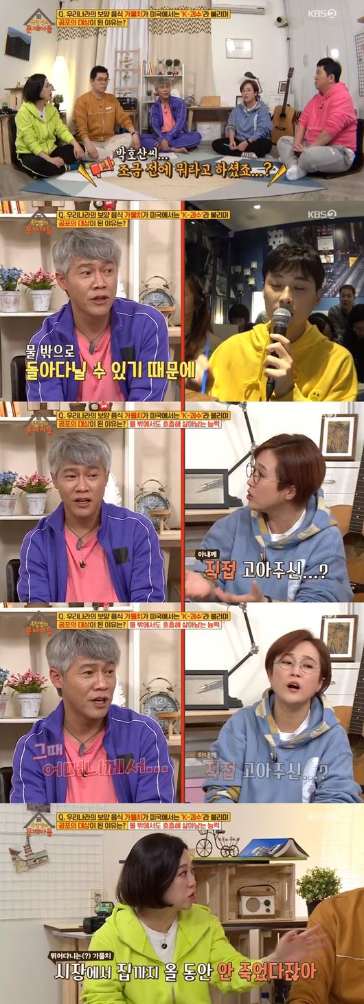 정형돈은 "미국에선 가물치가 아나콘다 같은 느낌이다"라고 말했다. 이에 박호산은 "가물치를 사서 가지고 나오면 물이 없어도 살아 있다. 계속 살아서 펄떡거린다"라고 말했다. 이에 MC들은 "가물치를 잡아 보셨나"라고 물었다. 이에 박호산은 "아내가 임신했을 때 사왔다. 내가 요리한 건 아니고 어머님이 요리하셨다. 난 그냥 사왔다"라고 말해 웃음을 자아냈다.