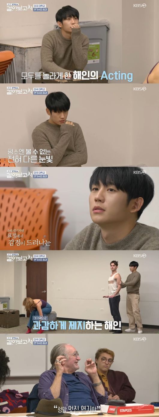 교수는 즉석에서 세 사람에게도 연기를 제안했다. 즉흥연기 제안에 당황, 이때 대사가 없다는 말에 안심하면서 정해인이 도전했다. 첫 무성연기에 도전인 만큼 모두가 주목했다. 정해인은 미국 배우지망생 학생들과 무대에 몰입, 소리 없이도 극에 빠져들었다. 그의 액팅이 모두를 놀라게 했다.