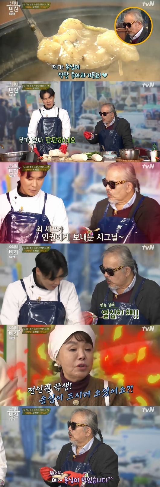 최현석은 전인권에게 무썰기를 SOS했으나 전인권은 "열심히 해라"며 바라만 봤고,김수미는 "전인권 학생, 옹심이 드시러 오셨냐"고 폭소했다. 전인권은 "옹심이 먹었다"고 이실직고했고, 김수미는 "울어야해 웃어야해, 어느 세월에 깍두기 할 거냐"면서 두 손 두 발 다 들어 웃음을 안겼다.