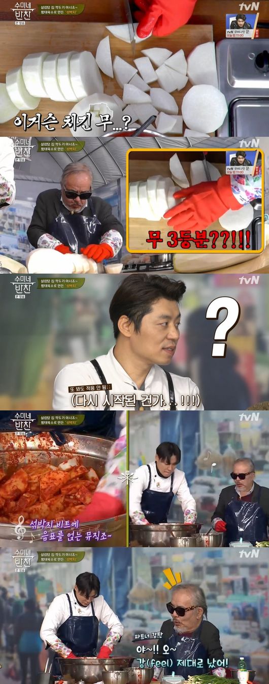 섞박지 무를 썰기 시작, 할배 3인방은 의식의 흐름대로 무를 썰어 웃음을 안겼다. 특히 전인권이 치킨 무처럼 조각내는 것을 발견한 최현석은 반만 잘라야한다고 알려주면서 "이번엔 안 이르겠다"며 환상의 팀워크를 보였다.