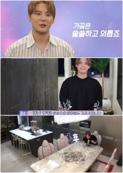지난 11일 방송된 MBC 새 파일럿 프로그램 '공유의 집' 1회에서는 박명수, 노홍철, 김준수, AOA 찬미, 박하나의 공유 생활이 시작된 가운데 김준수가 마지막 공유 멤버로 모습을 드러내 눈길을 사로잡았다. 김준수는 자신의 집을 솔직하게 공개하는 곳은 물론 10년만에 지상파 예능프로그램에 출연하는 것에 대해 "사실 실감이 안 난다. 물방울이 있는데 만지면 터질 것 같지 않나. 그런 느낌"이라며 출연 소감을 밝혔다. 더불어 "안방에서 제 얼굴을 보면 실감나지 않을까 싶다"라고 전했다.