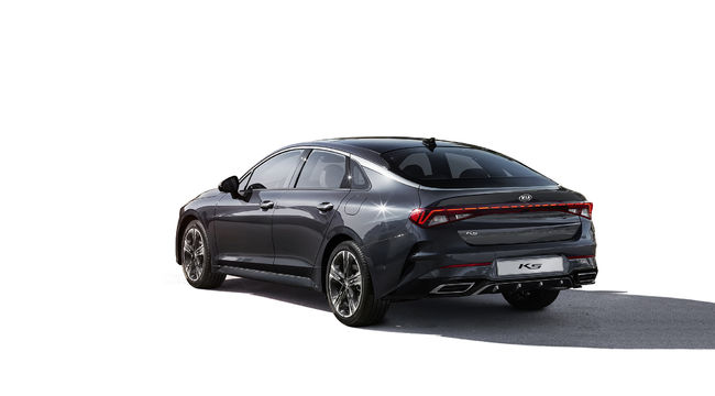 후면부 디자인은 전면부와의 연결성을 강조했으며 독창적인 디자인 요소를 통해 고급스럽고 안정감 있는 모습을 갖췄다. 리어콤비램프는 좌우가 리어 윙 형상으로 연결돼 넓고 안정적인 느낌과 함께 스포티한 이미지를 선사하며 램프가 켜질 경우 K5만의 독창적이고 고급스러운 느낌을 더욱 강조한다. LED 리어콤비램프는 심장박동 형상의 전면부 DRL과 연계한 그래픽을 적용해 차량에 활력을 부여한다. 좌우의 두 리어콤비램프를 연결하는 그래픽 바는 간격을 두고 점점 짧아지는 형태의 점등 패턴으로 속도감과 역동성을 표현한다.