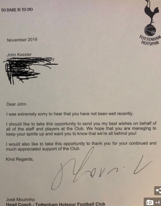 데일리 메일은 "무리뉴 감독은 토트넘의 열정적 팬인 존 케슬러의 몸이 좋지 않다는 소식을 듣고 직접 편지를 보냈다. 편지를 받은 케슬러의 친구가 그 사실을 SNS에 올려 화제가 되고 있다"라고 전했다.