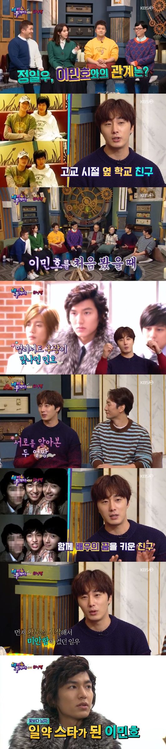 정일우는 "민호와 친한 형들이랑 처음으로 부모님 몰래 여행을 갔는데 뺑소니 사고를 당했다. 너는 4달 반 병원에 있었고, 민호도 아역같은 걸 할 때 였는데 1년동안 병원에 있었다. 민호랑은 처음 본 게 고등학교 축제 때였다. 멀리서 걔를 보는데 광채가 났다. 민호도 그때 저를 알고 있었다고 하길래 그때부터 배우의 꿈을 나누면서 친해졌다. 민호는 정말 배려심이 좋다. 사고가 났을 때도 저는 제가 죄를 지은 거 같아서 너무 미안했는데 퇴원하고 꽃보다 남자를 찍게 되서 너무 기뻤다"고 했다.