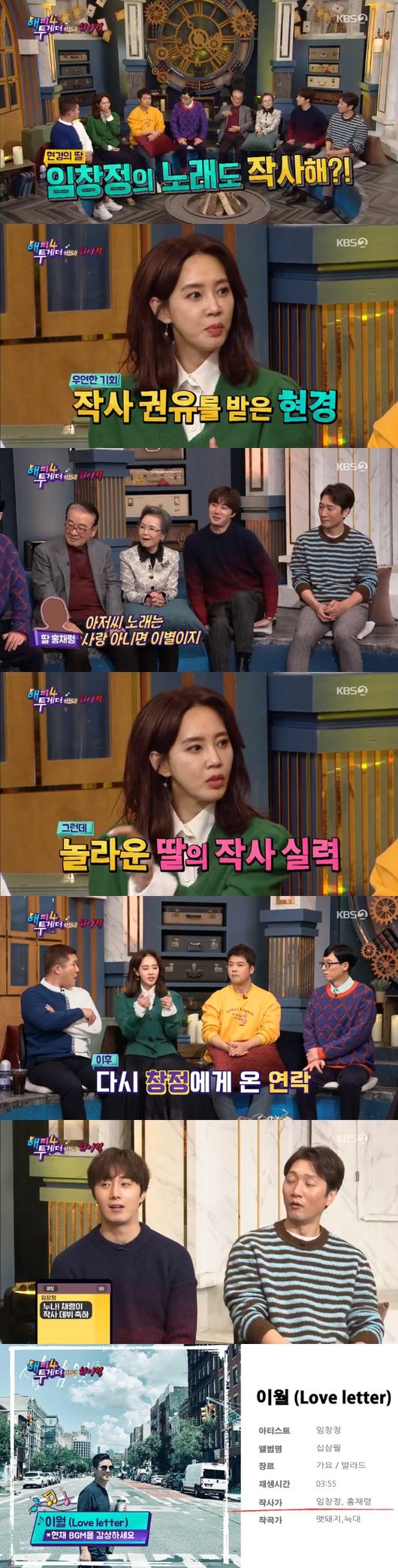 현경의 딸도 연기를 꿈꾼다는 이야기를 이었다. "초등학교 때 투포환을 잘 해서 2년동안 훈련을 받았다. 근데 원래 연기를 하고 싶다고 했던 아이였다. 저는 저를 보고 이걸 쉽게 생각한다고 생각해서 반대 했다. 근데 중학교 고등학교 계속 그걸 고집해서 지금은 외국에서 연기공부를 혼자 하고 있다. 그 친구가 해결해야하는 문제 같다."고 했다. 이어 현경의 딸이 임창정의 작사를 한 사연이 공개 했다. "원래는 제가 하려고 창정씨한테 제가 쓰겠다고 한 곡이었는데 딸이 해보겠다고 해서 창정씨한테 같이 보냈다. 저도 읽어보고 놀라긴 했는데 창정씨가 다음날 메시지로 '누나 딸 작사 데뷔 축하'라고 하더라. 짝사랑을 좀 해봤나 보다"며 사연을 공개 했다. /anndana@osen.co.kr