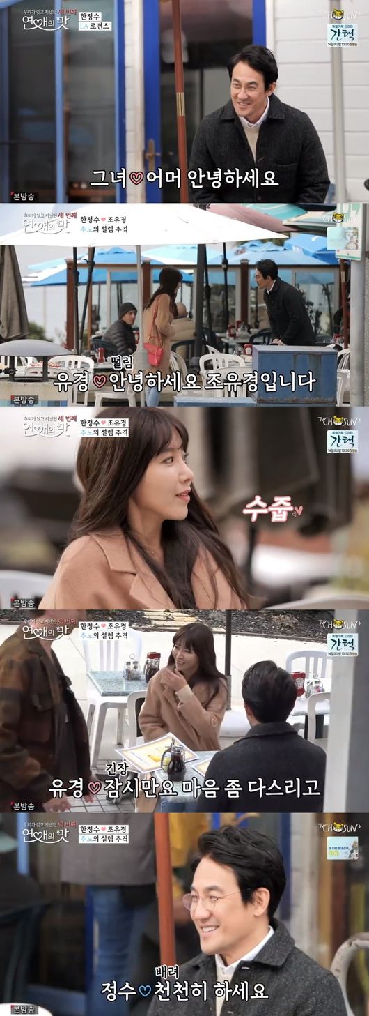 한정수는 당황하며 어쩔 줄 몰라하는 조유경에게 "괜찮다. 천천히 이야기 하라"며 배려했고 조유경은 마음을 다스린 후에 천천히 말을 이어갔다. 이어 한정수는 식사 메뉴를 고르며 "에그를 좋아한다"는 조유경의 말을 듣고 "에그머니나"라며 말장난을 쳤다. 이후에도 '쉴 새 없이 아재 개그를 던졌고 조유경은 "아무도 안 웃네요. 저만 웃네요. 재밌으시다"라며 웃음을 멈추지 않았다.