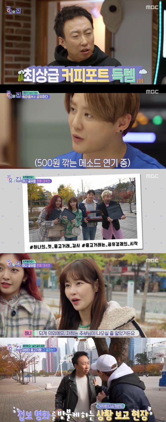 중고 거래를 마친 박하나, 찬미, 노홍철이 집으로 돌아왔다. 중고 첫 거래를 성공했다고 하자 김준수와 박명수는 득템한 커피포트를 꺼내며 자랑했다. 이어 다 함께 모여 오늘 했던 일들을 공유했다. 처음 알게된 물품 공유의 즐거움을 느꼈다면서 공유생활의 꿀팁을 주고 받았다.