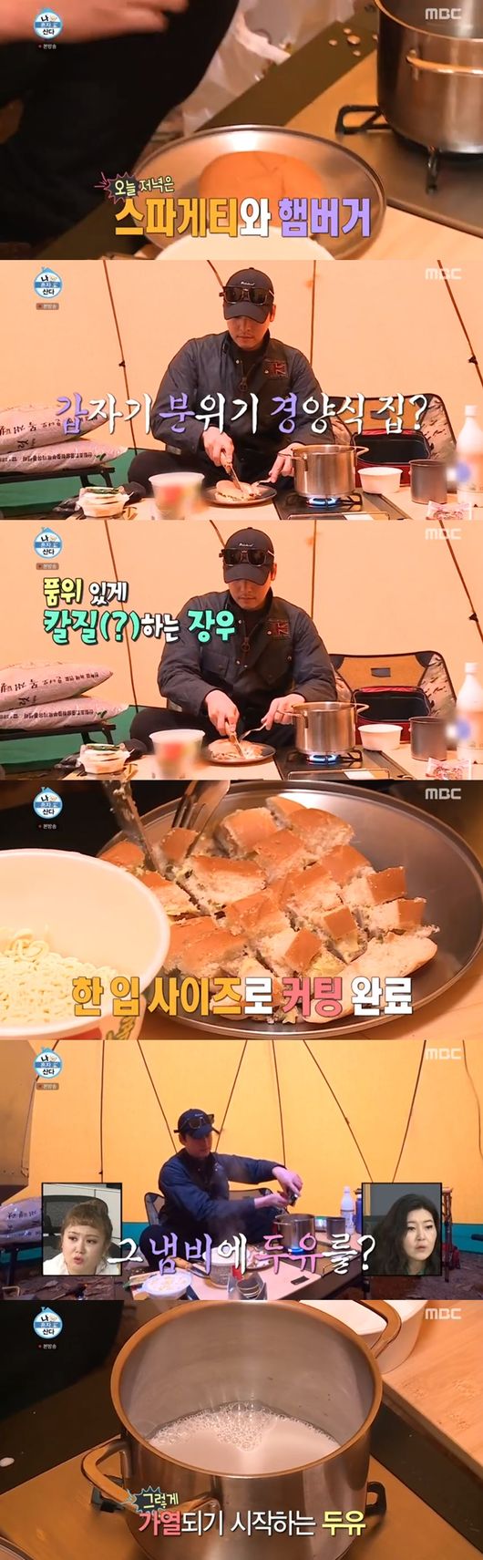 이장우는 캠핑에서의 식사로 편의점 햄버거와 스파게티 컵라면을 꺼내 눈길을 끌었다. 이장우는 스파게티 컵라면에 물을 부은 후 냄비에 두유를 넣고 끓였다. 이어서 잘게 자른 햄버거를 두유에 넣었다.