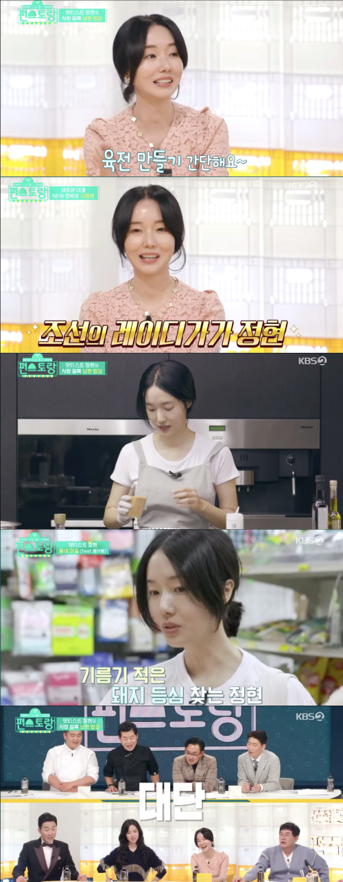 또한 이정현은 다양한 조리기구로 요리 고수의 면모를 드러냈다. 이와 함께 이정현은 전날 메뉴를 공개했다. 그는 남편을 위해 녹찻잎 위에 찐 보리굴비, 표고버섯 밥, 된장찌개, 명란구이, 장조림, 파김치를 차렸다.