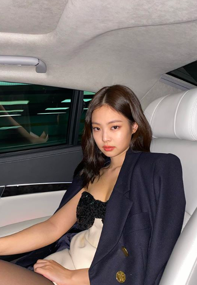 공개한 사진을 보면 튜브톱 드레스를 입은 제니가 차 안에 앉아서 카메라를 응시하고 있다. 화이트와 블랙 컬러로 이뤄진 드레스가 눈길을 끈다.