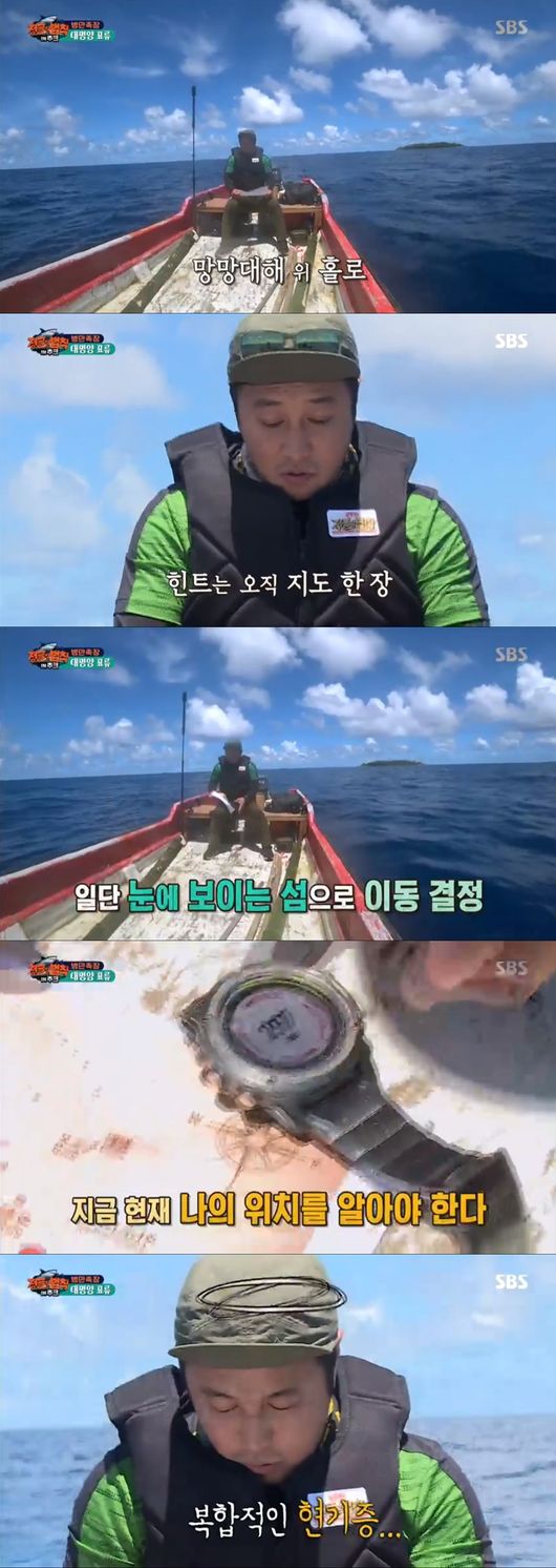 그 사이 김병만은 망망대해에서 혼자 남았다. 가만히 지도를 보던 김병만은 "너무 어지럽다. 저기 무인도에 가서 좀 쉬어야겠다"라고 말해 가까운 섬으로 이동했다.