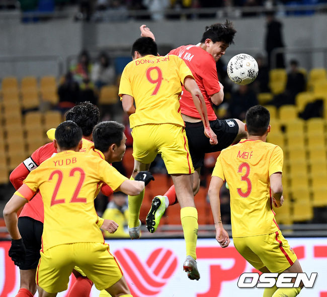 파울루 벤투 감독이 이끄는 한국 축구대표팀(FIFA랭킹 41위)은 15일 오후 부산 아시아드주경기장에서 열린 2019 EAFF E-1 챔피언십(동아시안컵) 2차전 중국((FIFA랭킹 75위)과 경기에서 김민재의 선제골에 힘입어 1-0으로 앞서갔다. 김민재는 전반 13분 코너킥 공격에 가담해 헤더골을 터뜨렸다.