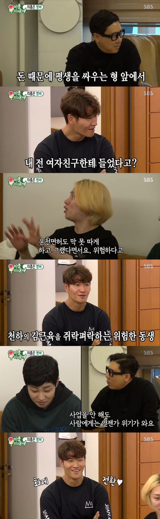 김종국은 "확실하면 아끼면 많아진다"고 했다. 그러자, 김희철은 "종국이형 전 여자친구한테 연애이야기 들었다"면서 "엄청 까다롭다고 들었다, 위험하다고 운전면허도 못 따게 했다더라"며 천하의 김종국을 쥐락펴락해 웃음을 안겼다.