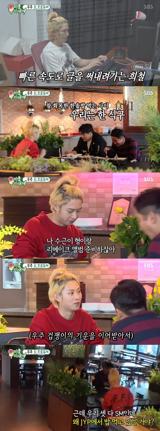 누군가와 함께 뷔페를 찾는 모습이 그려졌다. 바로 이수근과 신동이었다. 같은 SM 소속사인 세 사람, 하지만 JYP 구내식당에서 함께 모였다. 김희철은 이수근과 SM리메이크 앨범 준비 중이라 근황을 전해며 그 앨범 뮤비에 걸그룹 잇지가 출연할 것이라 했다.