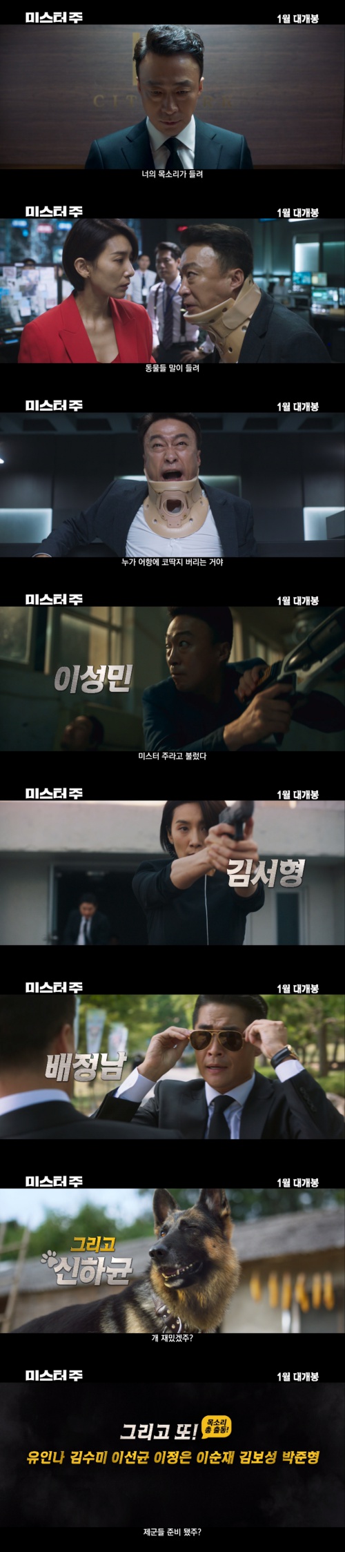 이성민, 김서형, 배정남 그리고 신하균까지 충무로 대표 배우들이 모여 선보이는 새해 복 터지는 코미디 영화로 화제를 모으고 있는 영화 '미스터 주'가 티저 예고편을 선보였다. '미스터 주'(감독 김태윤, 제작 리양필름㈜, 공동제작 ㈜HJ필름, 제공 한국투자파트너스·리틀빅픽처스, 배급 메가박스중앙㈜플러스엠·리틀빅픽처스)는 국가정보국 에이스 요원 태주가 갑작스런 사고로 온갖 동물의 말이 들리면서 펼쳐지는 사건을 그린 코미디 작품.