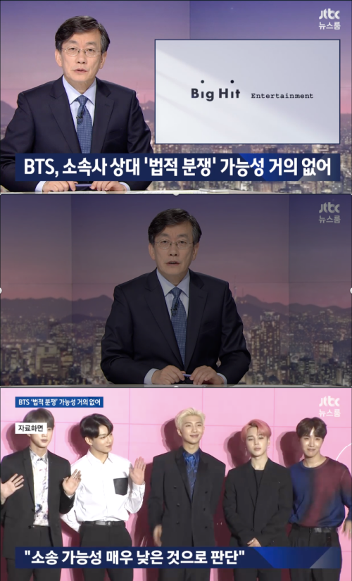 16일 오후 방송된 '뉴스룸'에서 손석희 사장은 "최근 '뉴스룸'에서는 방탄소년단 측이 소속사를 상대로 법적 대응을 검토하고 있는 정황을 보도해드린 바 있다. 후속 취재 결과 실제로 법적 분쟁으로 진행될 가능성은 거의 없는 것으로 파악됐다"고 밝혔다.