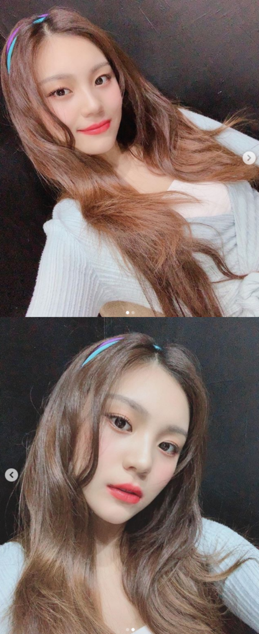 엄지는 지난 16일 여자친구의 공식 SNS에 두 장의 셀카를 공개했다.