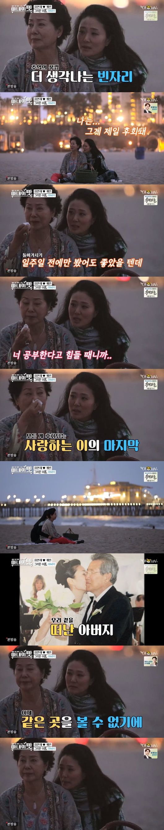 연제는 "내가 이튼을 키우면서 11개월에 정확하게 엄마, 아빠라는 말을 하는 거야. 내가 제일 먼저 한 말은 뭐야"라고 물었고 용여는 "엄마지"라고 말했다. 두 사람이 말없이 한동안 바다를 바라봤다. 이어 연제는 "우리가 마지막으로 아빠랑 봤던 바다가 저쪽에 있는 바다야. 근데 그때 내가 정말 행복했나봐. 그때 찍은 사진을 보면서 계속 엄마가 예쁘다고 했었어. 근데 엄마 나 매일 아버지랑 대화 한다"고 했다. 용여는 "이제 대화 하지마 돌아가신 분이랑. 아빠가 네 마음에 살아계시나봐" 라고 말하면서 눈물을 참았지만 이내 눈물을 쏟았다.