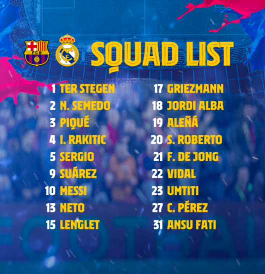 당연히 바르셀로나는 엘 클라시코에 기용 가능한 전력을 총 가동시켰다. 부상으로 최근 경기에 나서지 못하는 아르투르 멜루와 오스만 뎀벨레를 제외하면 최정예 라인업이다.