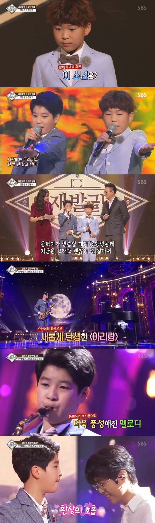 이날 정동원은 '영재 발굴단' 출신 천재 피아니스트 김요한과 함께 멋진 '아리랑' 무대를 완성해 눈길을 사로 잡았다. 정동원은 멋진 색소폰 실력까지 선보였다. 김요한은 "동원이는 연습할 때보다더 잘하는 것 같다"라고 말했다.