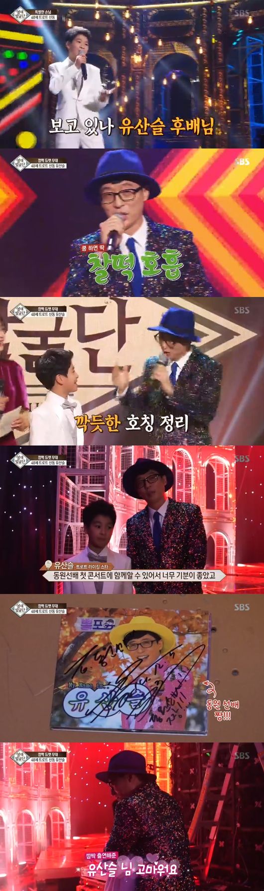 정동원은 평소 팬이라는 유산슬의 '사랑의 재개발'을 열창했다. 그때 유산슬이 무대로 등장했다. 정동원은 깜짝 놀랐고 두 사람은 사이 좋게 듀엣 무대를 선보였다.