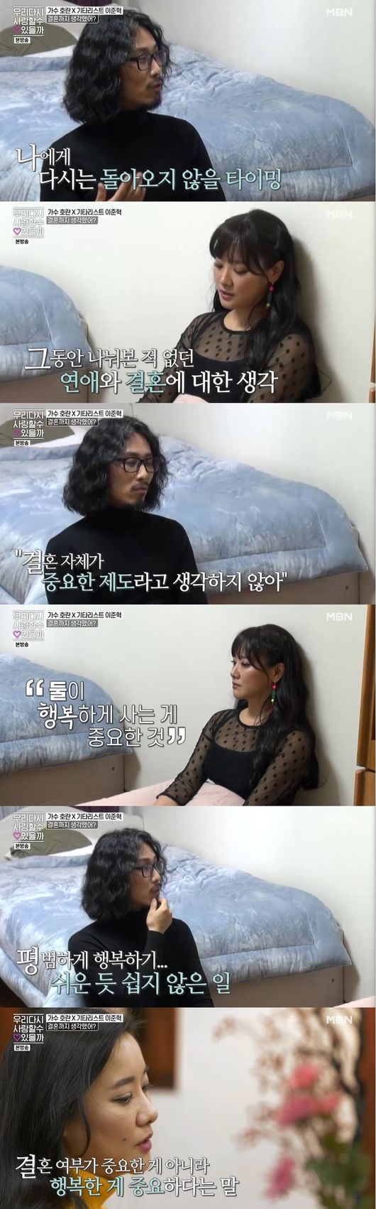 그동안 나눠본 적 없는 연애와 결혼에 대해 꺼낸 순간이었다.호란은 "오빠는 결혼이 꼭 필요한 것일 수도 있을텐데, 결혼생각을 한 번도 안했을까 신경쓰인다"고 하자,준혁은 "결혼자체가 중요한 제도라고 생각하지 않아, 같이 행복할 수 있는 것이 중요해, 둘이 행복하게 사는 것이 중요한 것"이라면서 "그게 서로에게 힘든 것, 평범하게 행복하기가 쉬운 듯 쉽지 않은 일"이라며 자신의 소신을 전했다.