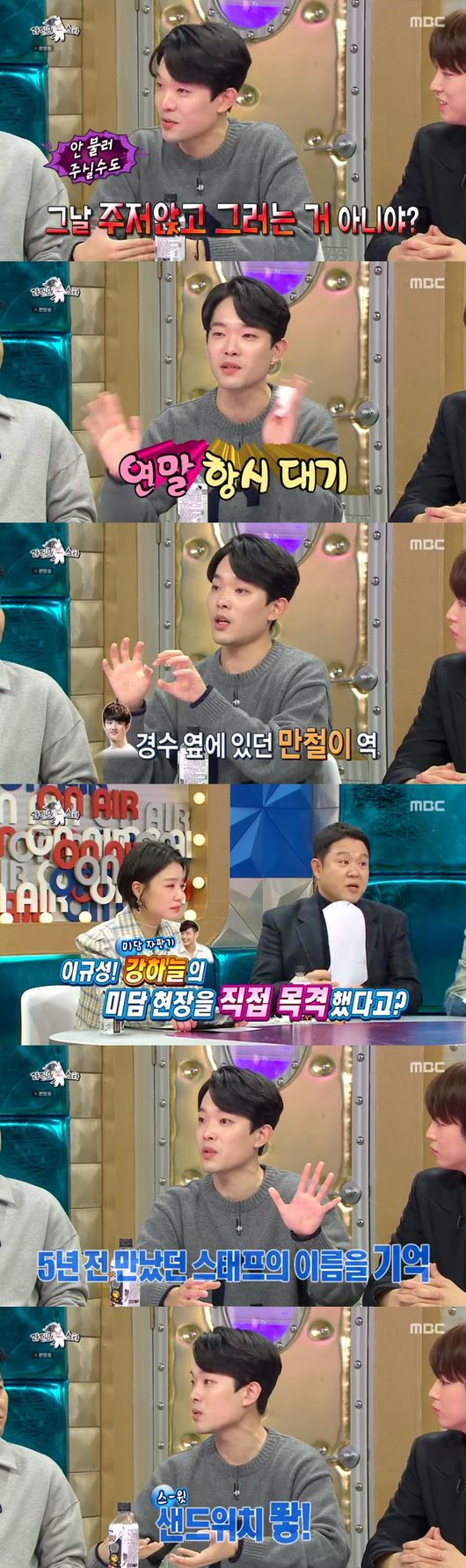 또, 이규성은 미담자판기 강하늘을 언급하며 "형이 옛날에 일했던 스텝들 이름을 외우더라. 이건 거의 초능력급이라고 생각한다"라며 "아침을 못 먹었다고 하면 어디선가 샌드위치를 가져온다. 감동 받았다"라고 말했다.