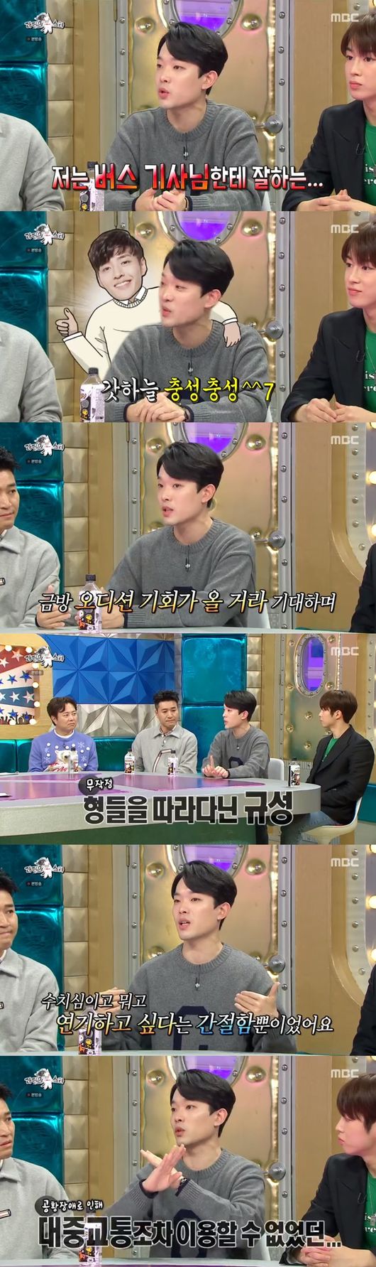 이어 이규성은 강하늘을 따라하게 됐다며 "형이 택시 기사님께 잘하는 여자가 이상형이라고 하길래 나는 버스 기사님들에게 인사를 잘하는 여자를 이상형으로 하게 됐다"라고 말해 주위를 웃음바다로 만들었다.