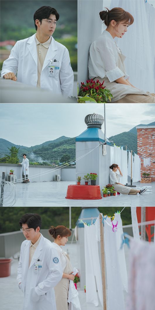 그런 가운데 공개된 사진에는 옥상에서 마주친 이강과 문차영의 묘한 기류가 포착됐다. 호스피스 옥상에서 홀로 눈물을 흘리는 문차영. 얼굴에 상처까지 달고 주체할 수 없는 감정을 털어내는 문차영의 모습이 궁금증을 자극한다. 그런 문차영을 한 발 떨어진 곳에서 묵묵히 바라보는 이강의 얼굴에도 복잡한 심경이 고스란히 비친다. 신경이 쓰여 가까이 다가가지만, 애써 외면하고 지나쳐가는 이강. 돌아선 이강의 뒤로 빨랫감을 꼭 쥐고 서 있는 문차영의 모습이 애틋함을 자극한다. 서로를 의식하기 시작한 두 사람 사이에 피어오르는 설렘이 달콤 쌉싸름한 로맨스에 기대감을 한층 고조시킨다.
