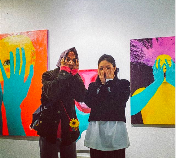 공개된 사진에는 송민호와 제니가 같은 포즈를 취하고 있다. 특히 두 사람은 송민호의 작품 속 인물과 동일한 포즈로 익살스러움을 더했다.