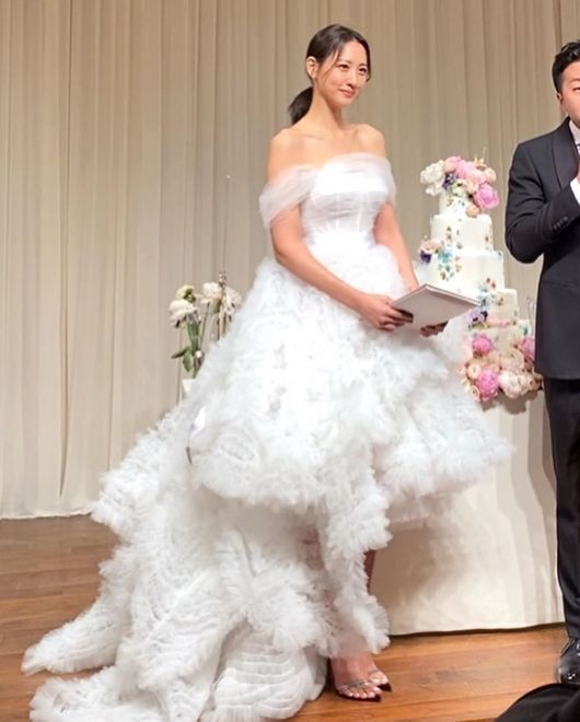 사진 속에는 수현의 결혼식 현장이 담겼다. 어깨 라인이 드러나는 새하얀 드레스를 입고 있는 수현은 머리를 묶어 청초한 분위기를 높였다. 잘록한 허리 라인과 쭉 뻗은 각선미가 인상적이다.
