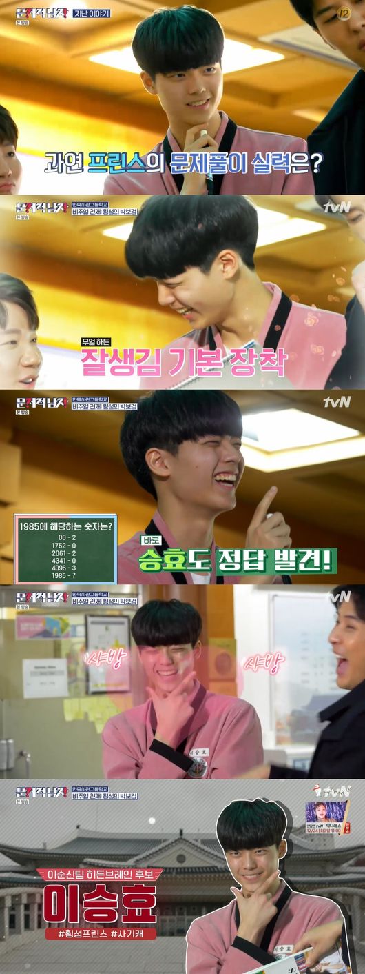 문제적 남자 멤버들이 민사고를 방문한 과운데, 비주얼 천재인 '횡성의 박보검' 이승효 학생의 실력을 알아봤다. 캐스팅만 14번을 받았다는 그는, 폭풍 실력으로 문제를 풀었고, 촛 번째 문제부터 맞히며 사기 태릭터로 등극했다. 김지석 팀은 히든 브레인으로 이승효 학생을 선택했다.