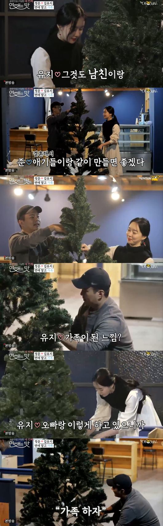 이어 두 사람이 함께 크리스마스 트리르 만들며 카페를 꾸몄다. 정준은 "결혼해서 애기들이랑 같이 만들면 좋겠다"면서 "기승전 결혼 얘기, 사람들한테 욕 먹었다, 이런 생각이 나는 걸 어떡하냐"고 말했고, 유지도 "오빠랑 이렇게 만드니까 가족된 느낌"이라며 남다른 감회를 보였다. 정준은 "연애말고 가족하자"며 농담 반, 진담 반으로 초고속 프러포즈를 해 모두를 놀라게 했다.