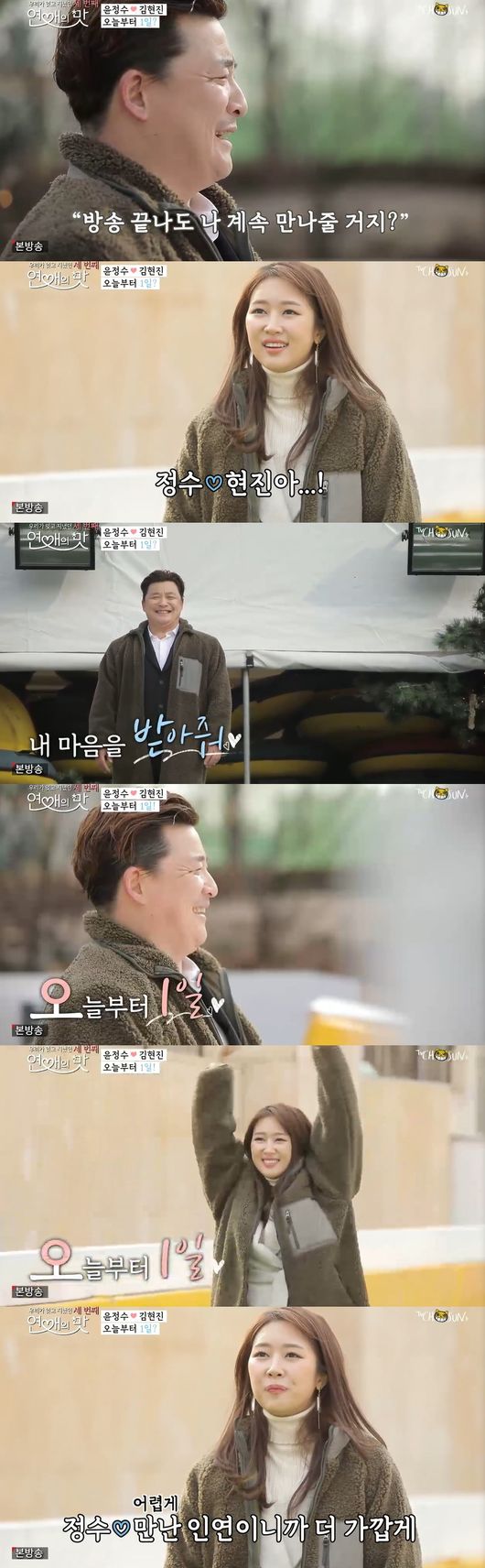현진은 "답하면 굴러서 내려올 거에요?"라고 농담하면서 "멋지게 내려와라"며 머리위로 동그라미를 그리며 윤정수의 마음을 받아줬고, 썸을 종료하고 연인이 된 두 사람을 모두가 축하했다.
