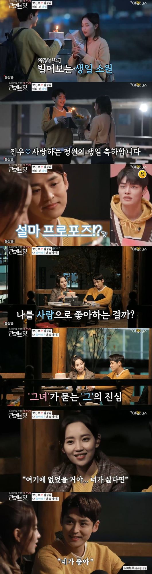 박진우, 김정원 커플이 그려졌다. 박진우는 생일인 정원을 위해 보물찾기 이벤트를 준비했다. 첫 생일을 함께한 정원에게 박진우는 직접 고른 하트 은팔찌를 선물했다.정원은 "말로는 표현하지 않지만 행동이 따뜻하니까 사람으로 나를 좋아하니까, 이성의 감정이 있는 걸까 헷갈린다"고 말을 꺼냈다.