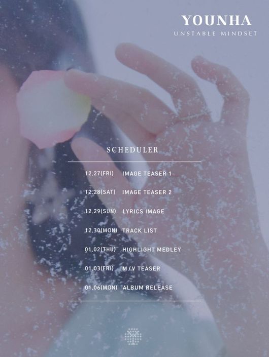 또 스케줄러 이미지에 따르면 윤하는 티저 이미지 1, 2와 리릭 이미지, 트랙리스트, 하이라이트 메들리, 타이틀곡 뮤직비디오 티저를 차례대로 공개할 예정이다.