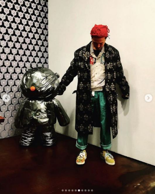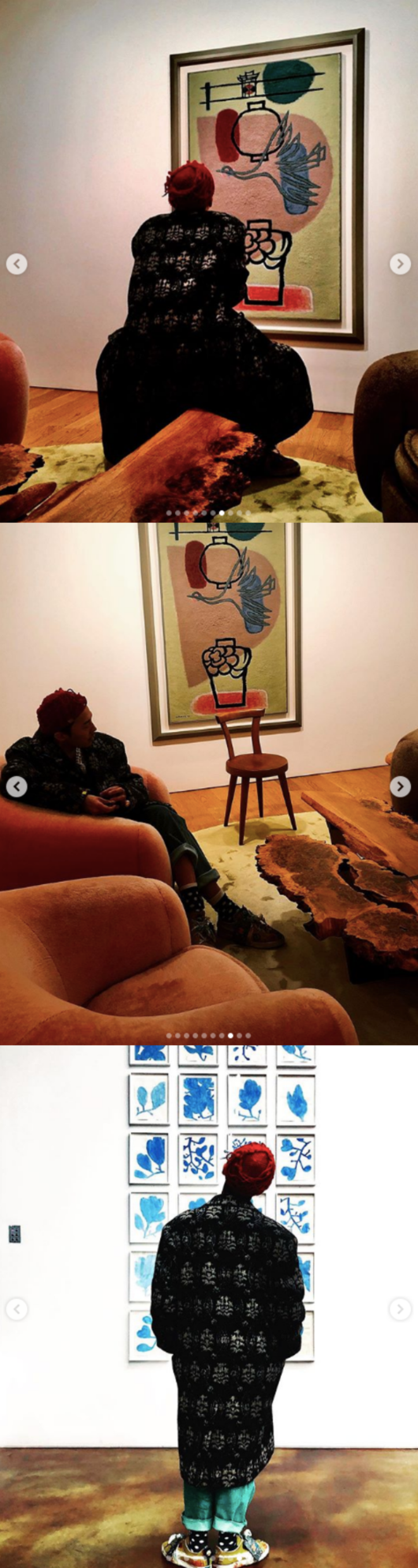공개된 사진에는 한 갤러리를 방문회 전시 작품들을 감상하고 있는 지드래곤의 모스이 담겨 있다. 지드래곤은 독특한 무늬의 빨간색 모자와 흰색 셔츠, 초록색 바지와 롱코트로 스타일리시한 패션을 완성했다. 누구나 쉽게 소화하기 힘든 화려한 패션으로 지드래곤만의 존재감을 드러냈다.