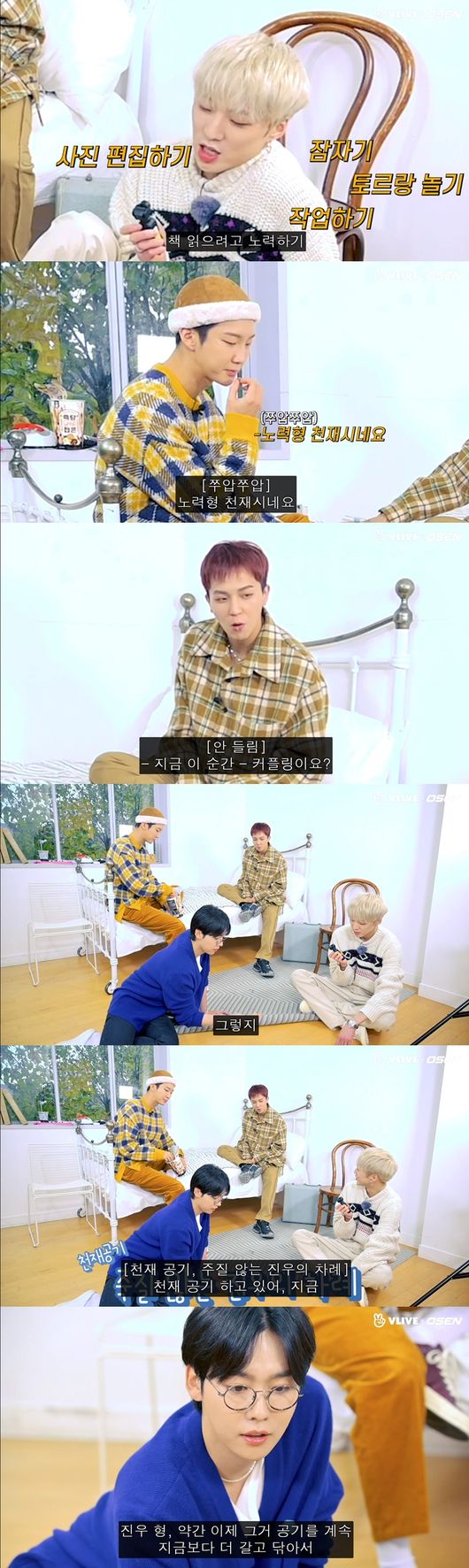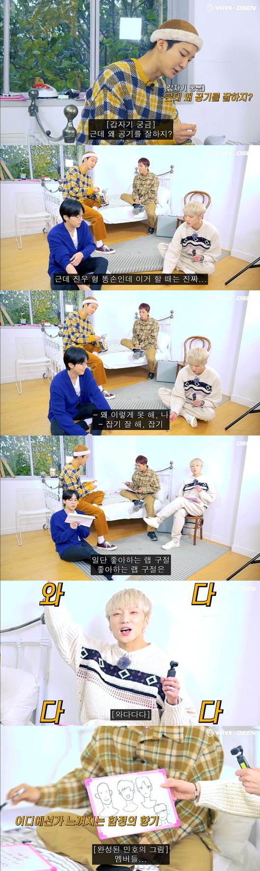 다음으로 멤버들이 뽑은 미션들이 이어졌다. 강승윤은 좋아하는 랩 구절 읽기, 이승훈은 멤버들 얼굴 그리기 미션을 받았다. 진우는 셀카 사진 잘 찍는 법이라는 질문을 받자 "얼굴이 잘 생기면 된다"라고 답을 내놨다.