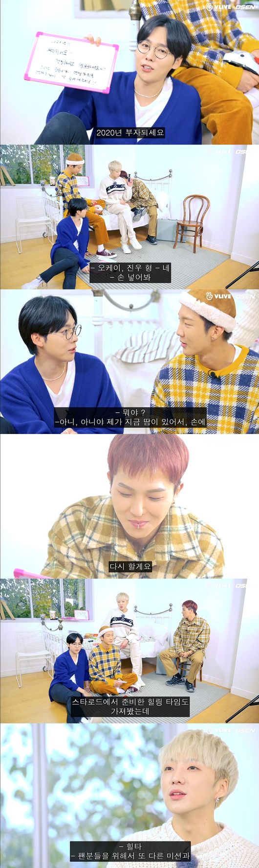 이어 강승윤은 "팬분들이 책 선물을 정말 많이 해주신다. 침대 맡에 두고 일부러 읽으려고 노력중이다"라고 말했다. 힐링이 제일 필요한 순간에 대해서 묻자 송민호는 "요즘 같이 쓸쓸한 바람이 불 때 힐링이 필요하다"라고 말해 눈길을 끌었다.