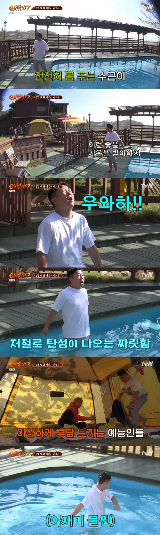 식사를 마치고 숙소로 돌아온 멤버들은 각자 휴식을 즐겼다. 그러던 중 갑자기 이수근이 반팔에 반바지 차림으로 등장해 시선을 사로 잡았다. 이수근은 숙소 옆에 있던 수영장에 들어 갔다. 이수근은 "이게 산에서 내려온 물이다 좋은 기운을 받아야 한다"라고 말했다.